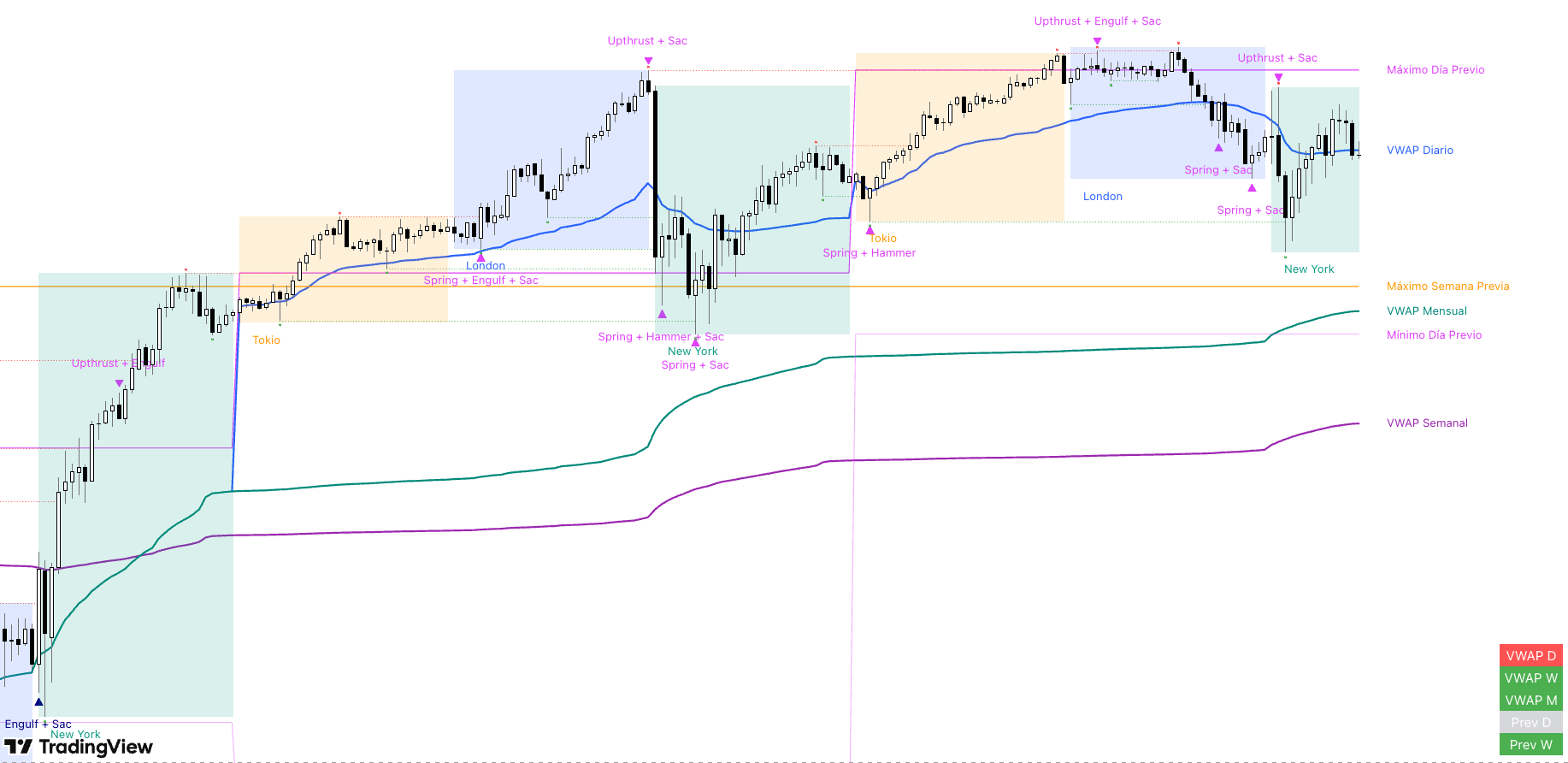 - Niveles relevantes automáticos. Muestra los Highs y Lows previos diarios, semanales y mensuales para contextualizar las zonas operativas con precisión.